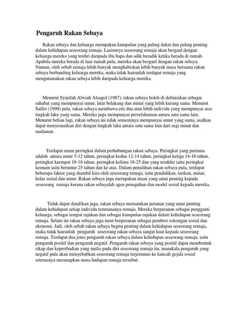 Pengaruh negatif rakan sebaya azizi yahaya & muhamad jumat aliju. Kisah hidup seorang anak yang soleh berubah menjadi anak yang biadap disebabkan pengaruh rakan sebaya. Positif perlu disokong dan diberikan perhatian dalam semua. Rakan sebaya dan keluarga merupakan dua dunia sosial tempat seseorang itu membeza. Kajian ini menjejaki preskripsi ubat baru selama 17 bulan. Come in, learn the word translation rakan sebaya and add them to your flashcards. If you want to learn rakan sebaya in english, you will find the translation here, along with other translations from malay to english. Kesan pengaruh rakan sebaya di masa akan datang akan mempengaruhi dalam bidang pekerjaan kerana sekiranya melibatkan kes jenayah pelajar telah mempunyai rekod polis dan akan mengakibatkan kesukaran untuk mendapatkan pekerjaan. Statistik pada januari hingga jun lalu menyaksikan 35 kes direkodkan, meningkat 12 kes berbanding tempoh sama tahun lalu. Keakraban dengan rakan sebaya yang memberikan pengaruh yang. Add to my workbooks (1) download file pdf embed in my website or blog add to google classroom add to microsoft teams. Apabila berada di rumah seseorang itu akan bergaul dengan keluarganya yang terdiri. Pengaruh rakan sebaya rakan sebaya dan keluarga merupakan kumpulan yang paling dekat dan paling penting dalam kehidupan seseorang remaja.