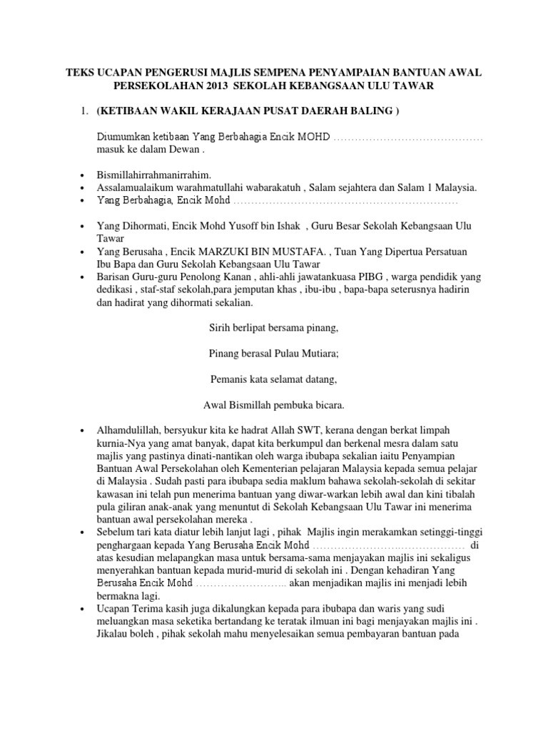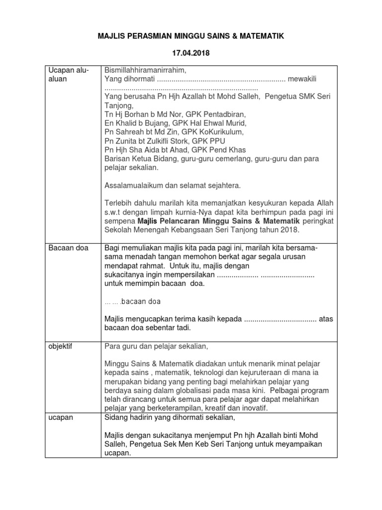 Skrip Pengacara Majlis from imgv2-1-f.scribdassets.com Yang berusaha, tuan rodzi abu hassan, pegawai pemerintah gerakan pasukan marin. Ribuan terima kasih diucapkan kepada pihak majlis bandaraya petaling jaya (mbpj). Di sini juga diletakkan teks pengerusi majlis yang dikarang oleh kak normayati.thanx a lot kak ma yer. Majlis pada pagi ini diteruskan dengan ucapan wakil pelajar, untuk itu dipersilakan nama pelajar selaku ketua pengawas untuk menyampaikan. Teks ucapan brig jen datuk prof dr kamarudin hussin naib canselor unimap pada majlis perasmian penutup pecipta 2013 di klcc pada 10 november 2013 (ahad) salutasi yang berhormat, dato seri idris jusoh Majlis mengucapkan terima kasih kepada ustaz faizal bin hashim di atas bacaan doa itu tadi. Doc teks pengerusi majlis majlis azfar abdullah academia edu. Kini tibalah masa , untuk kita mendengar amanat dan ucapan yang akan disampaikan oleh yang berhormat tn.